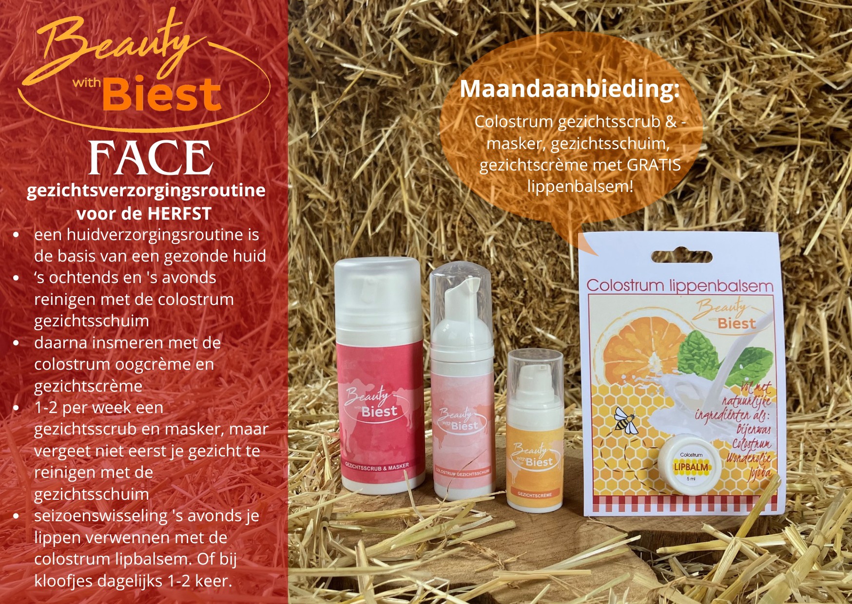 Biest, ook wel colostrum genoemd, heeft een paar hele bijzondere eigenschappen. Zo is biest een echte jeugdbooster. Het zit vol weerstandsverhogende, celgroeistimulerende en versterkende voedingsstoffen voor de huid. Zo is biest in staat om wonden, littekens, zweren en cystes sneller te genezen. En alsof dat nog niet fijn genoeg is, vermindert het ook nog eens rimpels en fijne lijntjes.