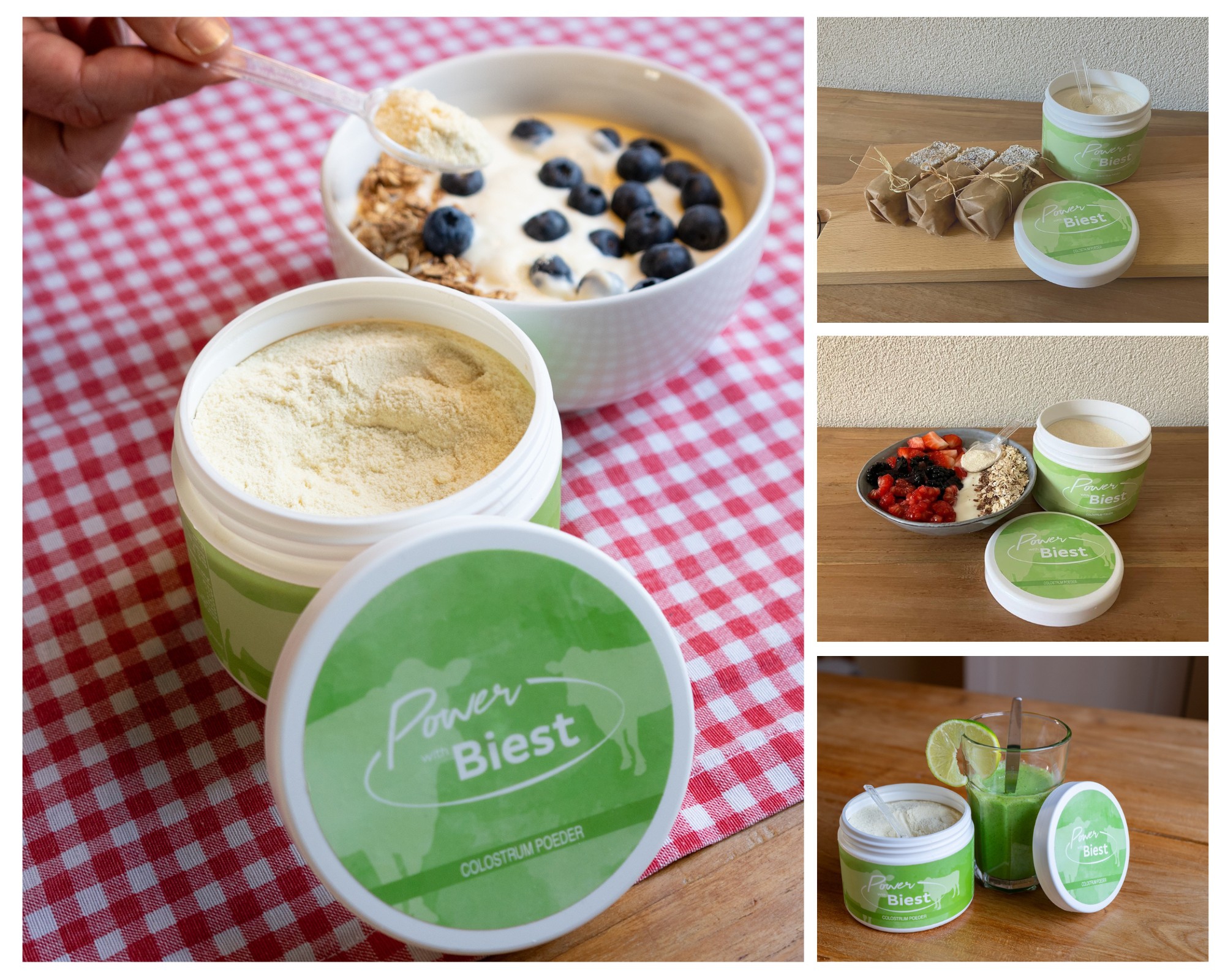 De Power with Biest is colostrum poeder. Colostrum, weten we nog wat dat is? Een ander woord voor biest, inderdaad. We weten inmiddels dat biest voor de kalfjes dé sleutel is voor een betere gezondheid en een optimaal welzijn. Maar wist je dat dit ook geldt voor volwassenen? De biest is als een ‘fontein van jeugd’ voor het hele lichaam. Met de Power with Biest neem jij de controle over je lichaam en geef je je immuunsysteem een boost!